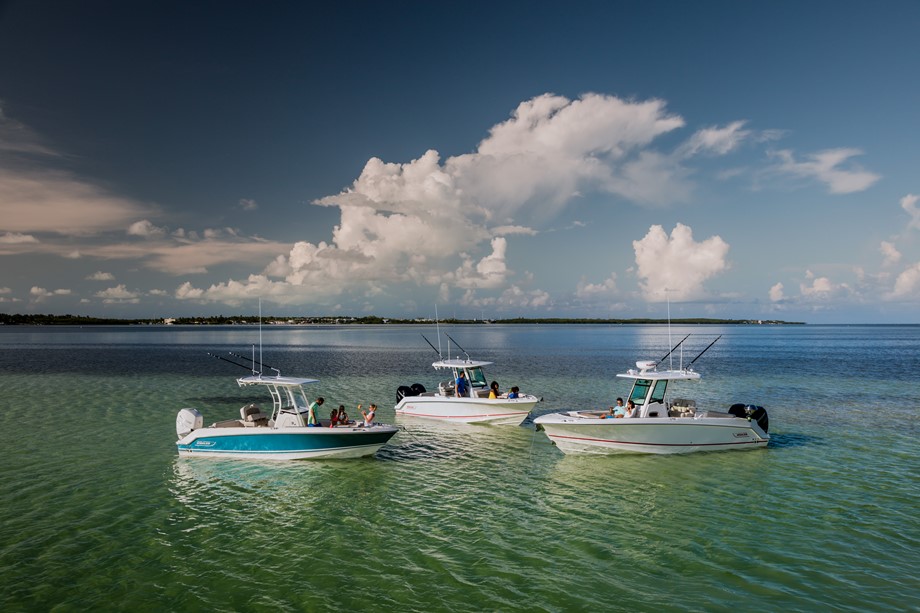 Optional Fishing Package with fishbox pump-out, fishing station, raw-water washdown and transom-mounted rod holders.