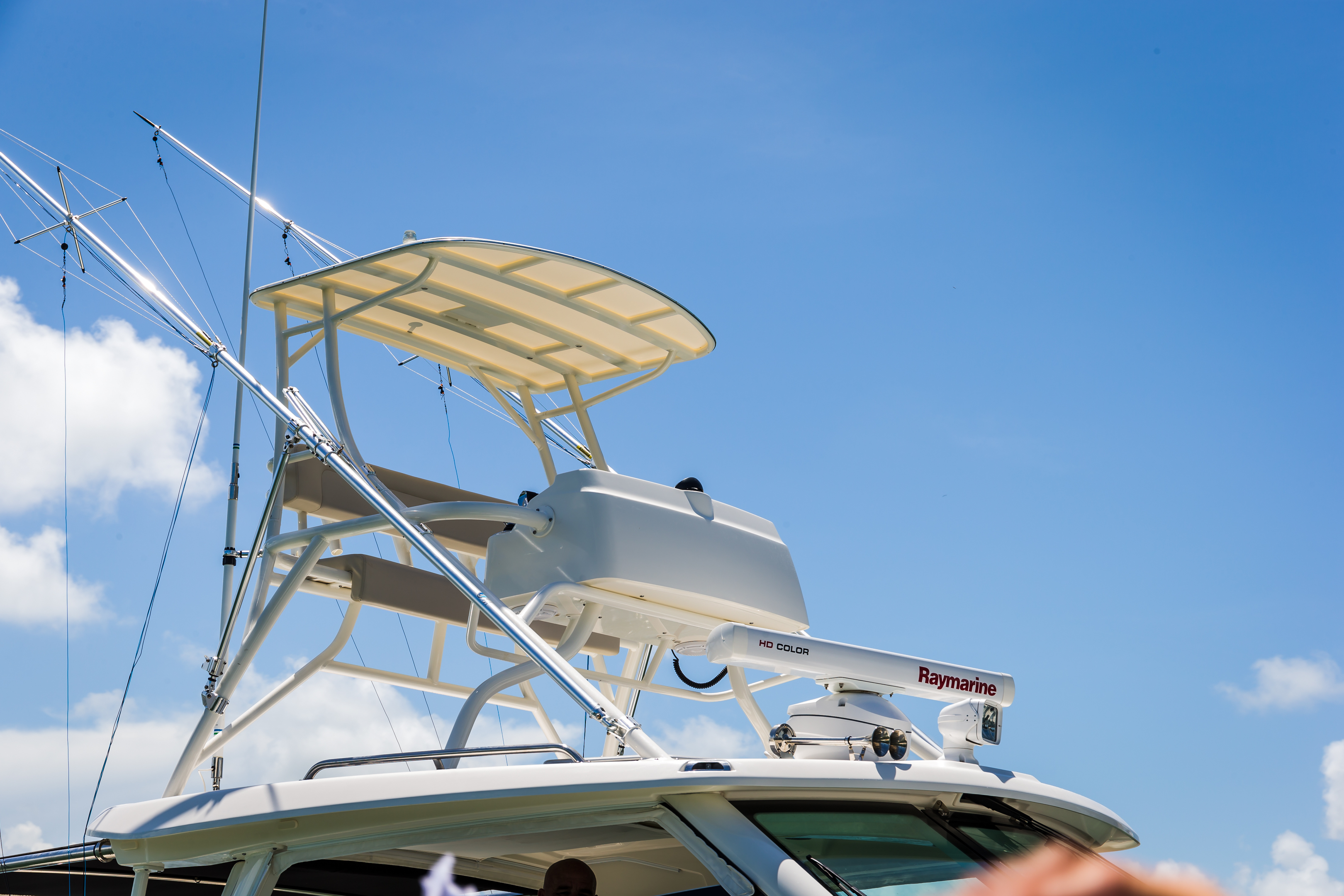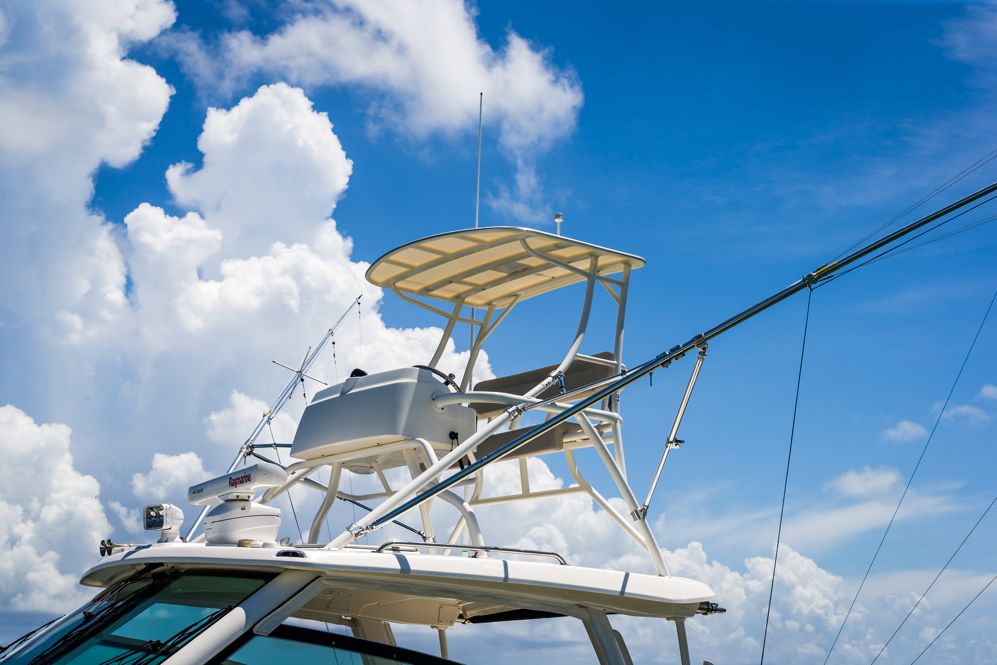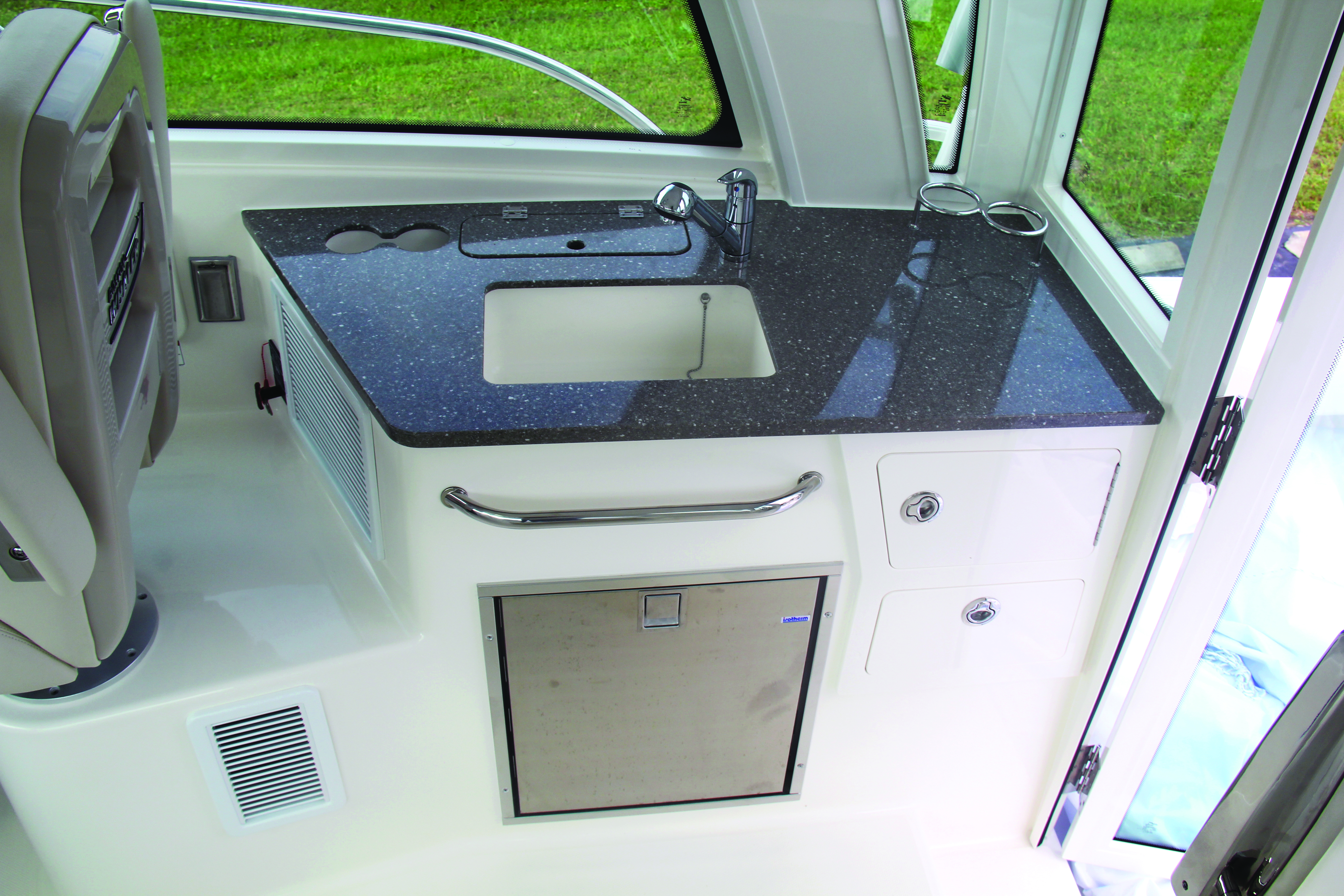 Convenient cockpit prep station with optional flip-top grill, huge storage and YETI® cooler.