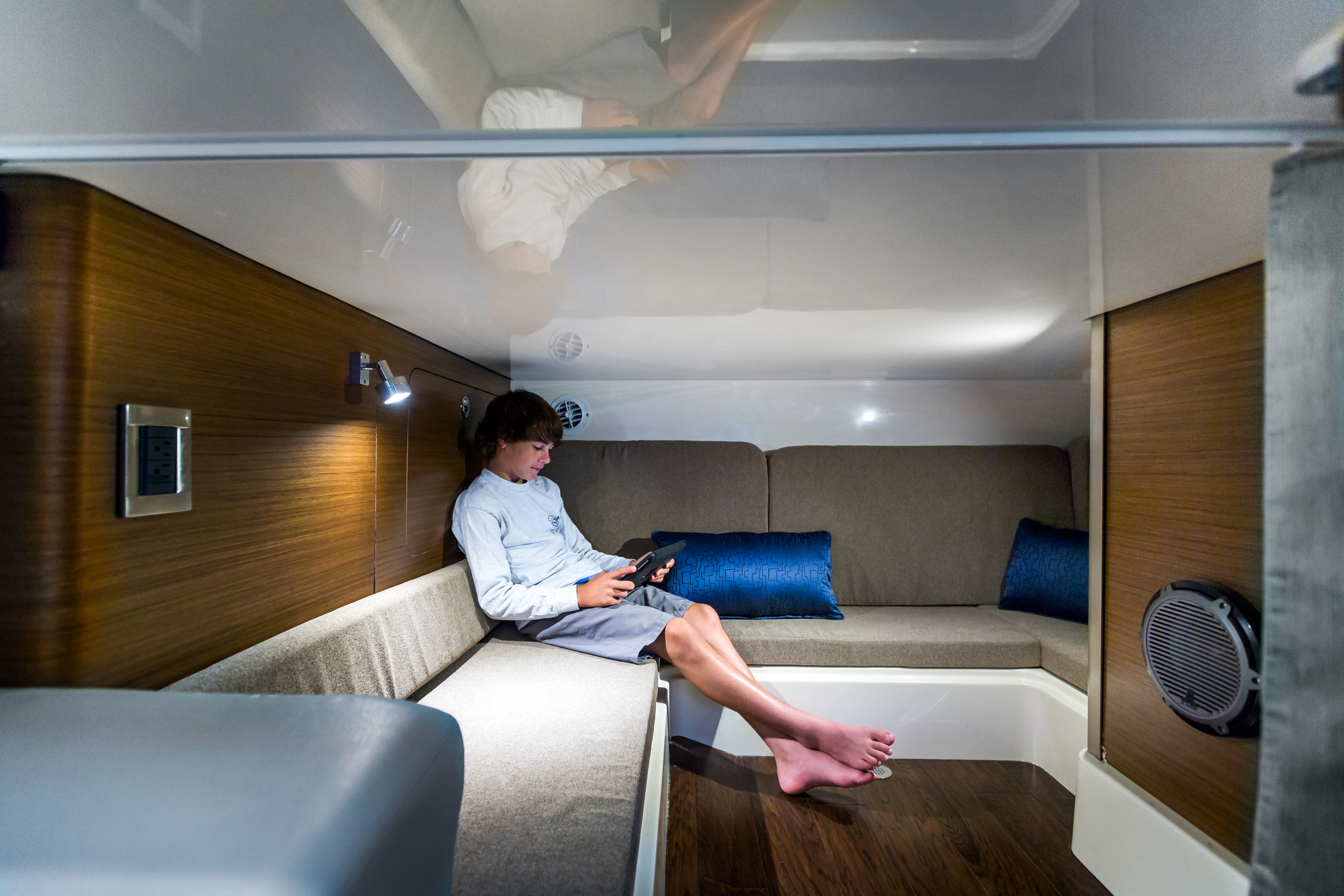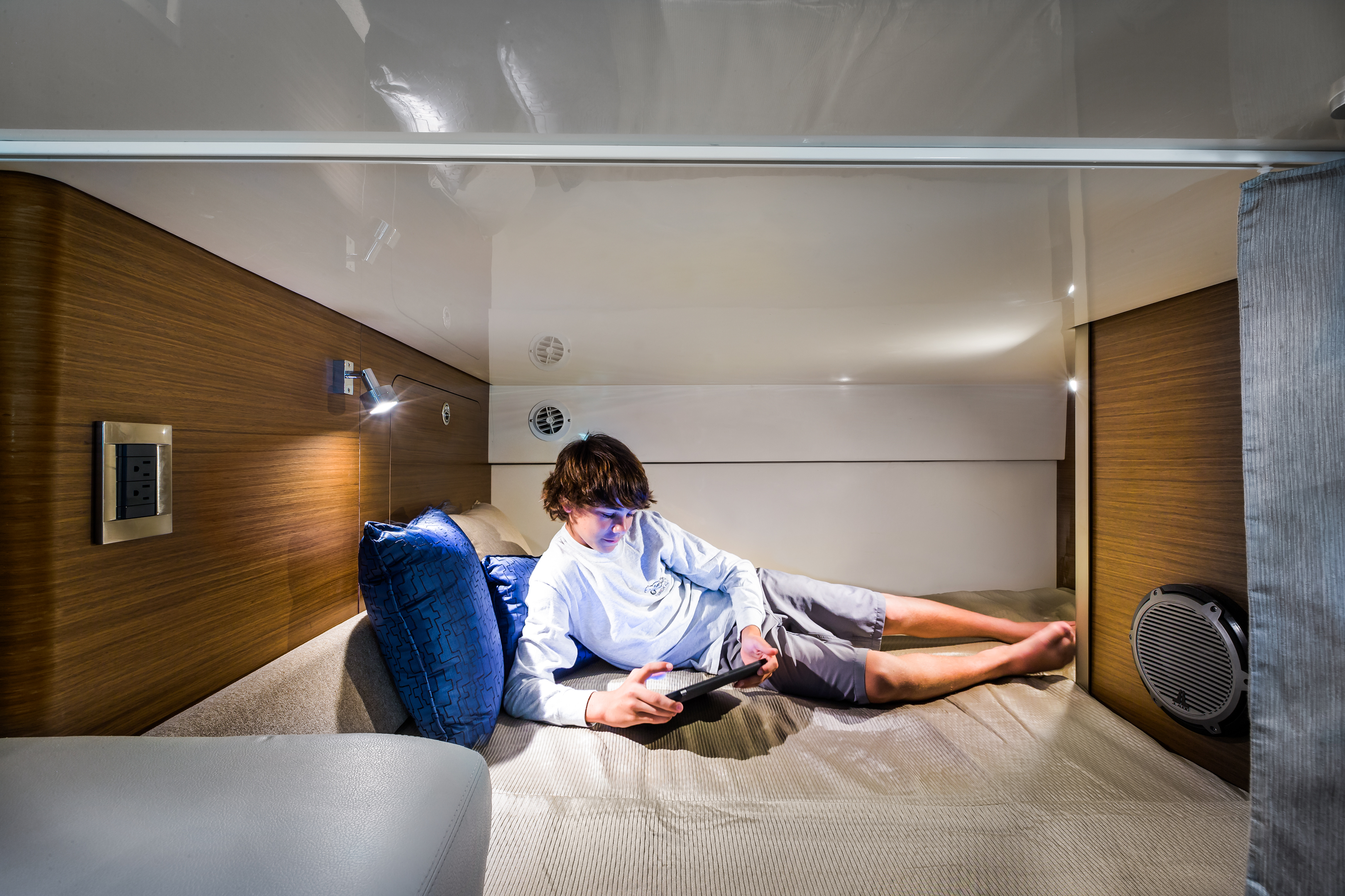 Rod storage above the settee in the cabin holds gear securely.