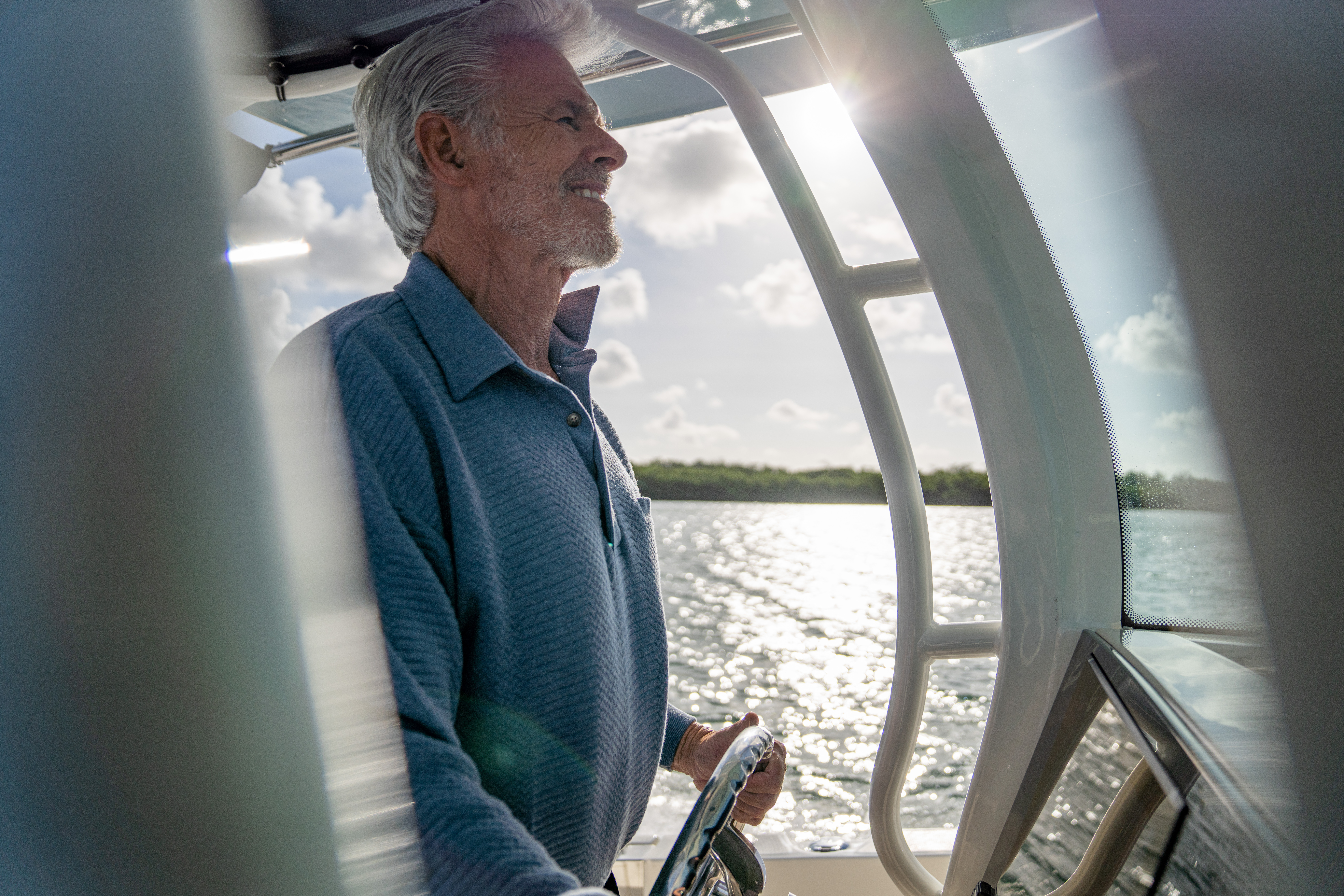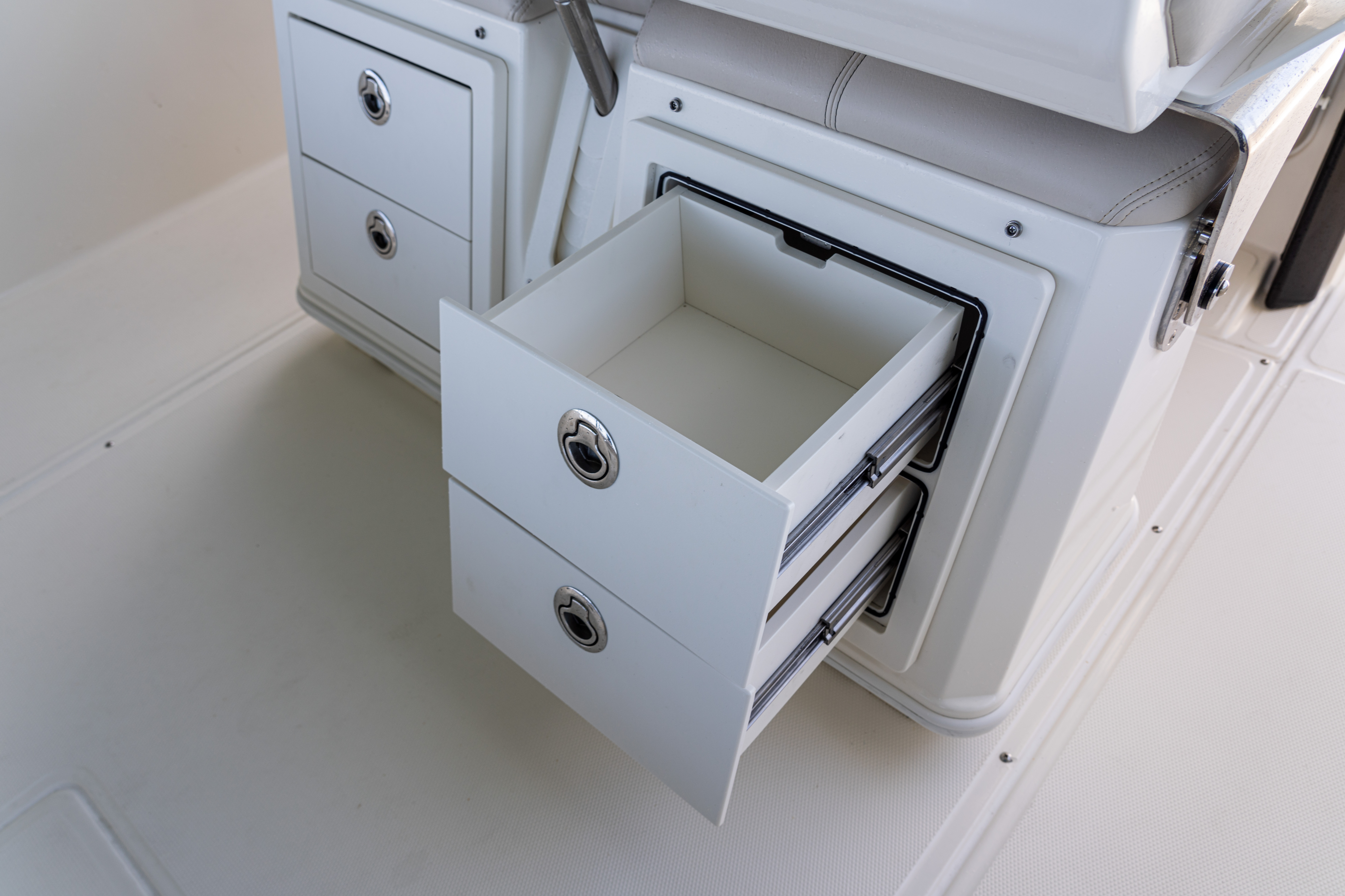 - Innovative helm seat transforms from a captain’s chair into a leaning post or a vantage point for trolling with the push of a button.