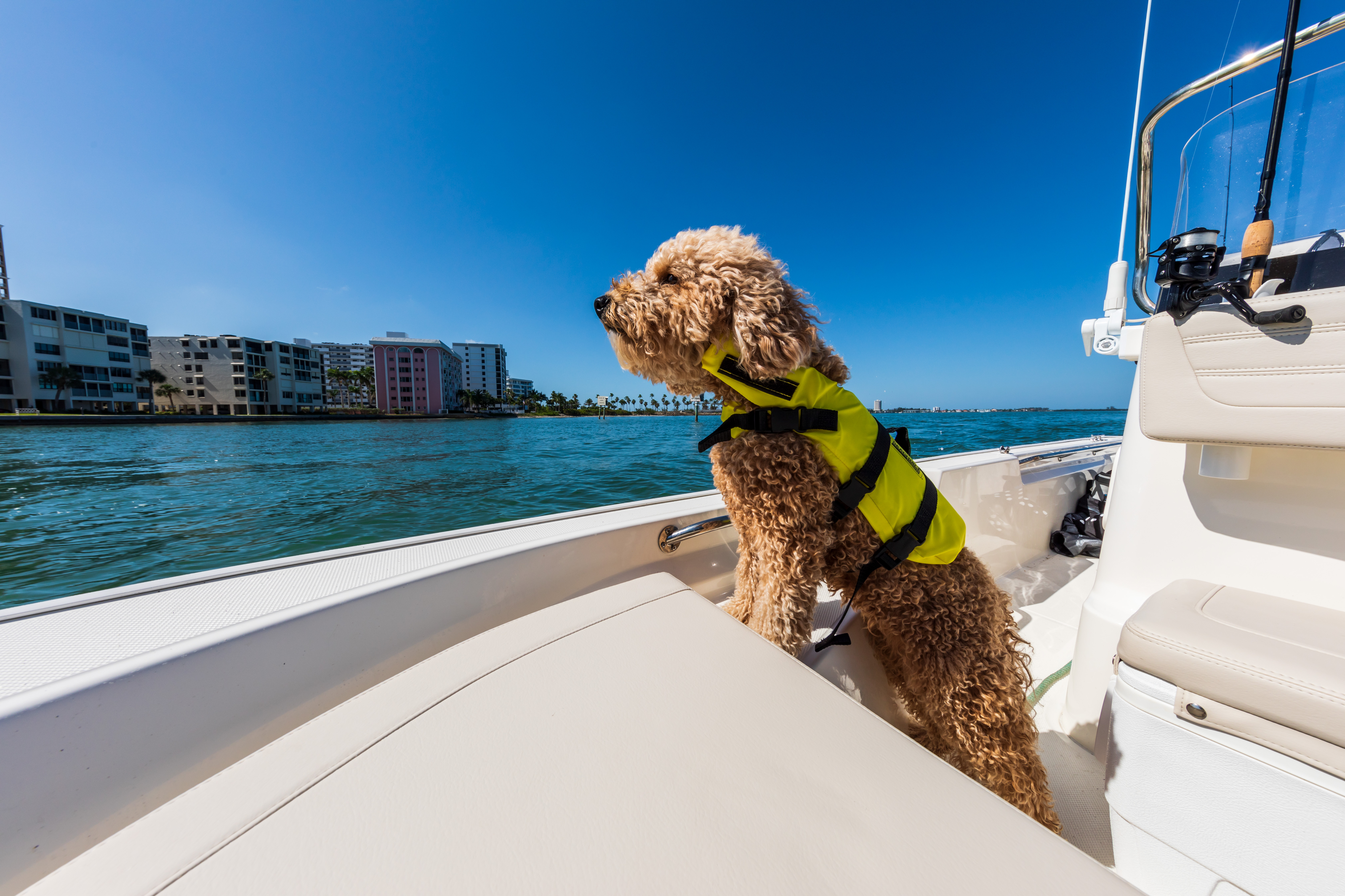 - Standard galvanized trailer with LED lights and swing tongue for easy transport to and from the water.