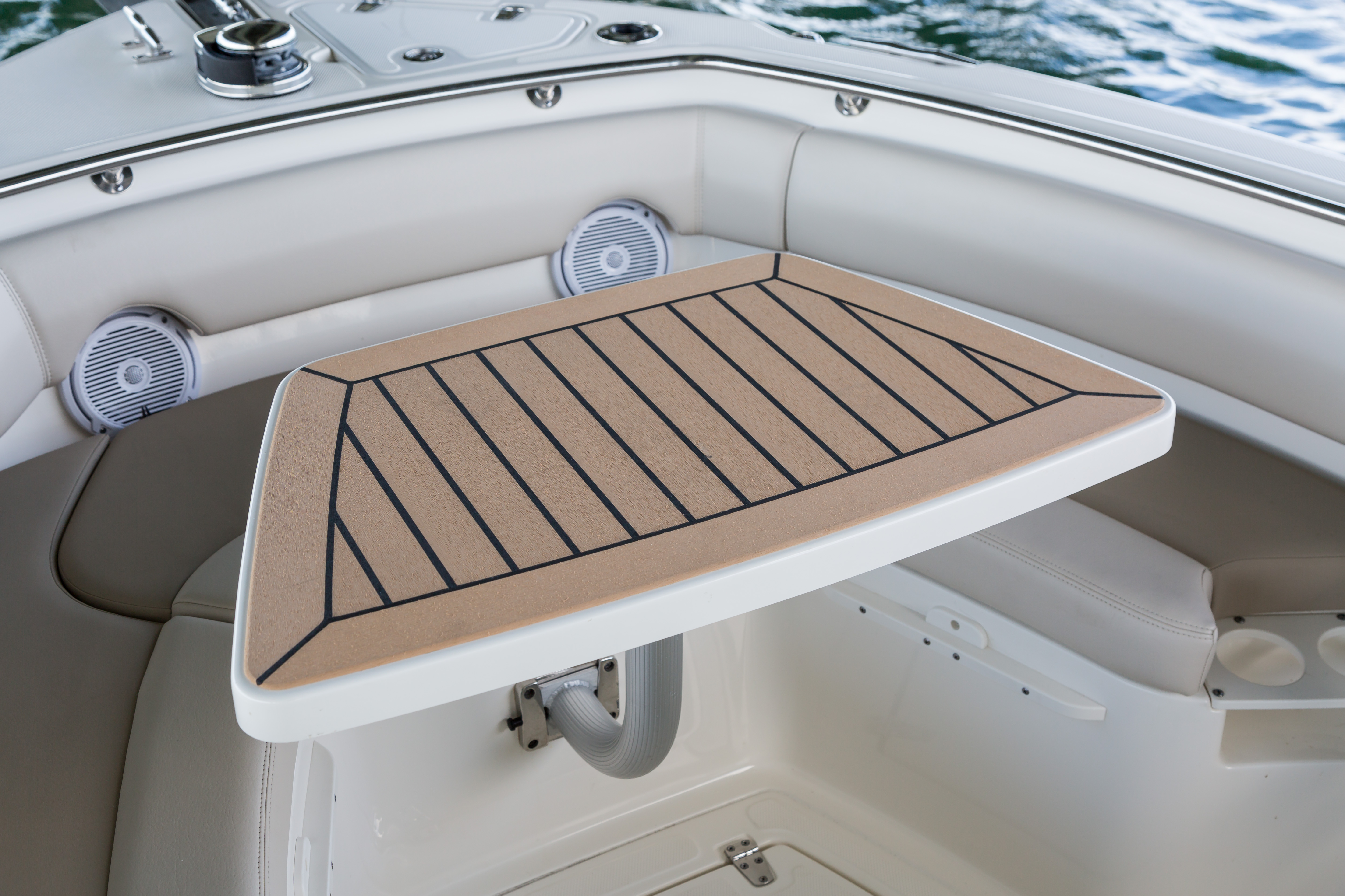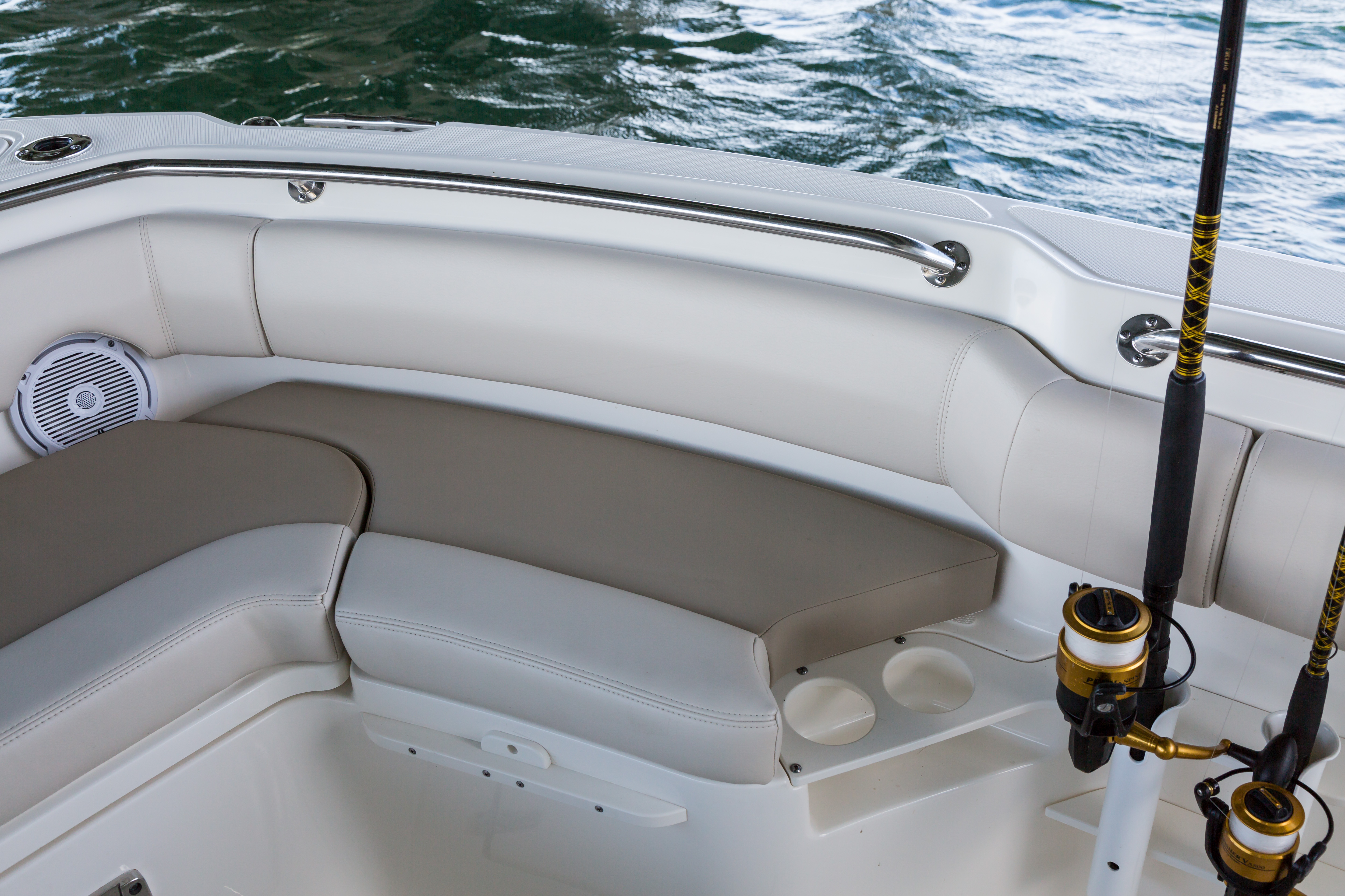 Fold-out stern seat with backrest bolster provides additional comfort for all your crew.