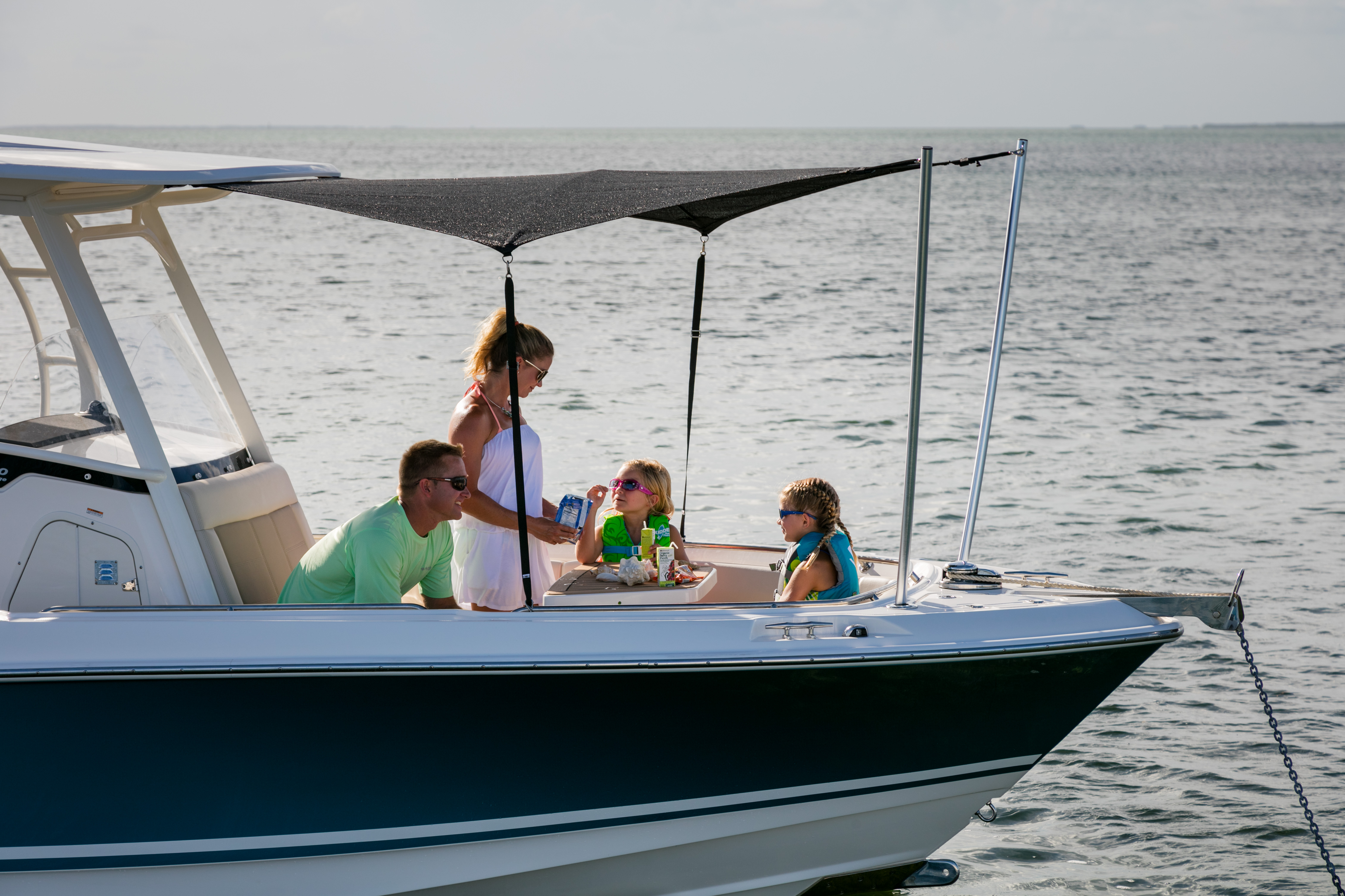 Optional anchor windlass and chain make anchoring safe and convenient.