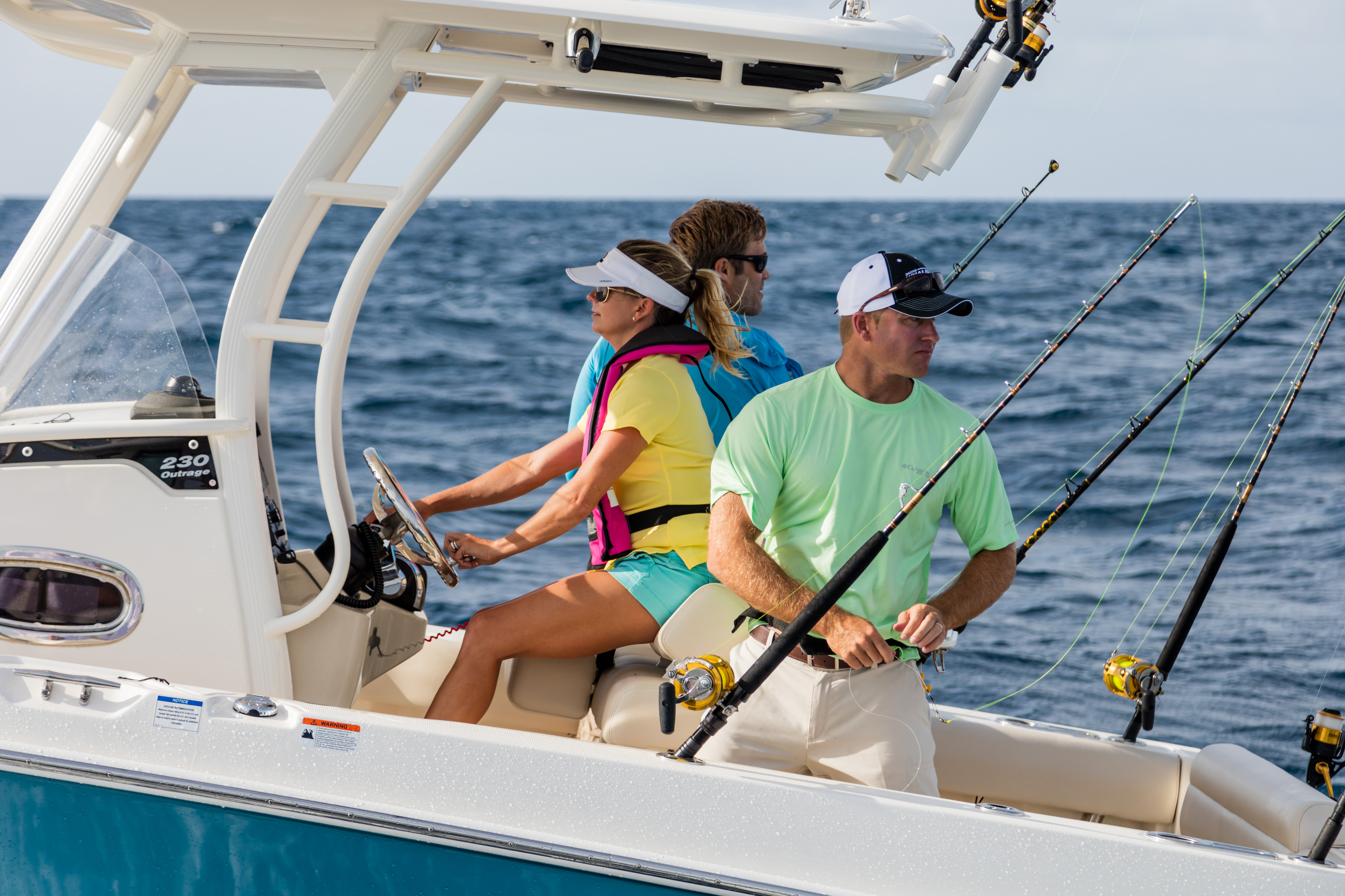 Optional Fishing Package with fishbox pump-out, fishing station, raw-water washdown and transom-mounted rod holders.